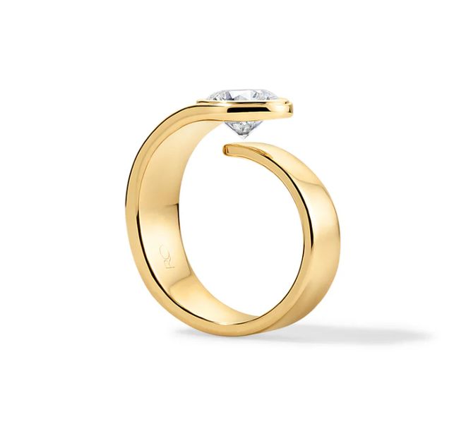黄金戒托巧妙的缠绕于手指之上,一枚2克拉钻石镶嵌在戒指的正中,虽然克拉数不大,但钻石的亭部完美呈现在人们的面前,引导人们的视觉不自觉的向内延伸,仿佛要探寻其中隐藏的无尽奥秘。