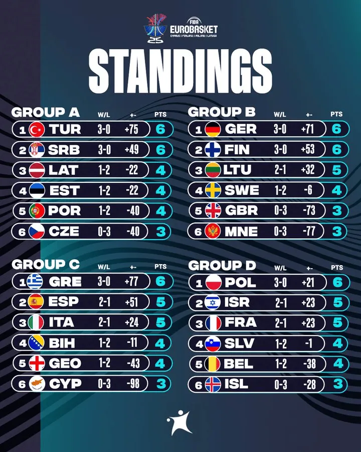 虎扑09月01日讯 今日BasketNews晒目前的欧锦赛积分榜并发问: