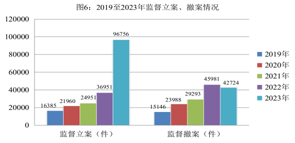 全国检察机关共监督立案96756件,同比上升1.6倍。监督立案后起诉29974人,同比上升89.7%。作出生效裁判25693人,同比上升82.7%,其中,判处有期徒刑以上刑罚25259人,判处有期徒刑以上刑罚率98.3%,同比增加0.9个百分点。监督撤案42724件,监督撤案率100%,同比增加0.1个百分点,呈逐年上升趋势。