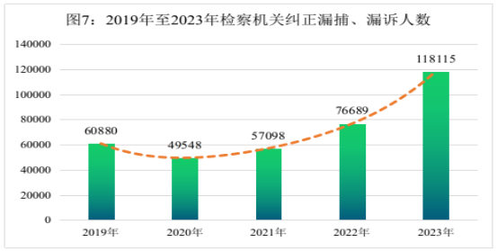 全国检察机关共纠正公安机关遗漏提请逮捕的犯罪嫌疑人19485人,同比上升12.8%;纠正遗漏起诉同案犯98630人,同比上升66%,追捕、追诉力度不断加大。纠正漏捕判处三年有期徒刑以上刑罚8781人,纠正漏诉判处有期徒刑以上刑罚78137人,共计86918人,纠正漏捕、漏诉判处有期徒刑以上刑罚率96.5%,同比增加11.1个百分点,质量总体较高。